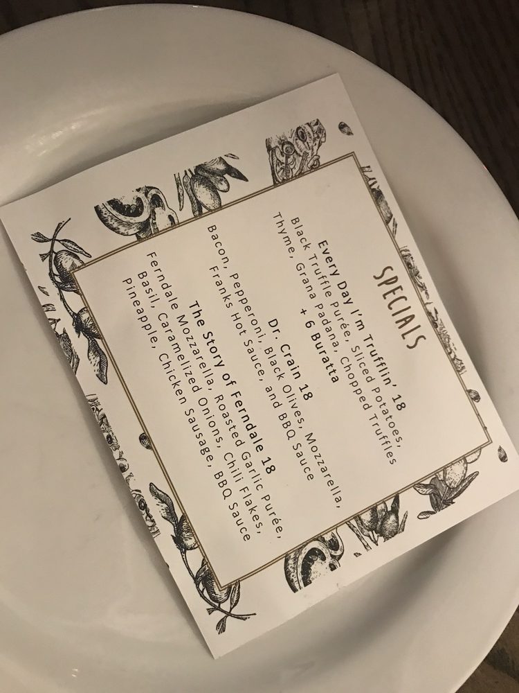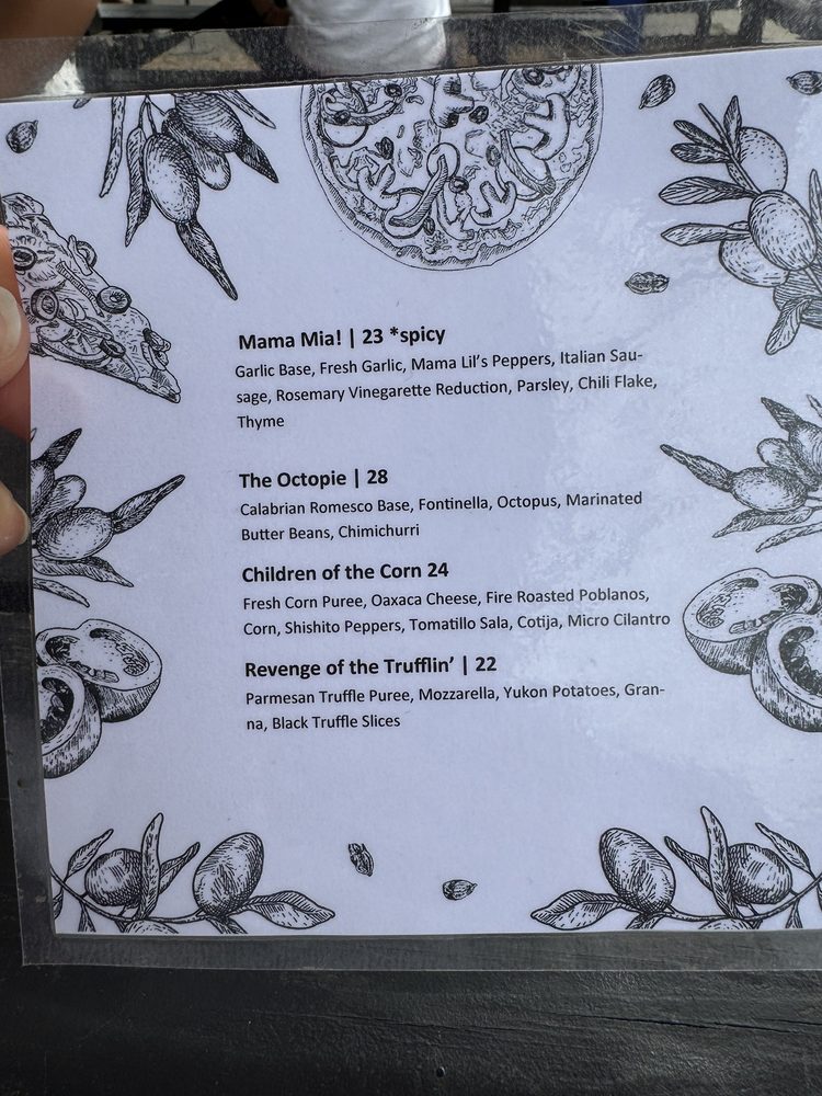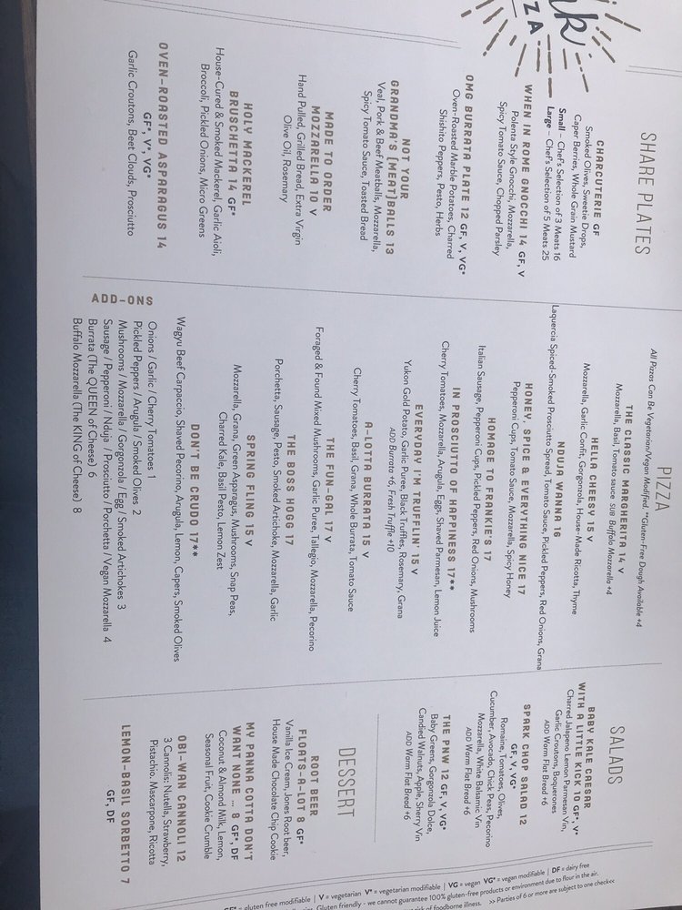 V. Yukon Gold Potato, Truffle puree, Thyme, Black Truffles, Grana This is a vegetarian pizza.